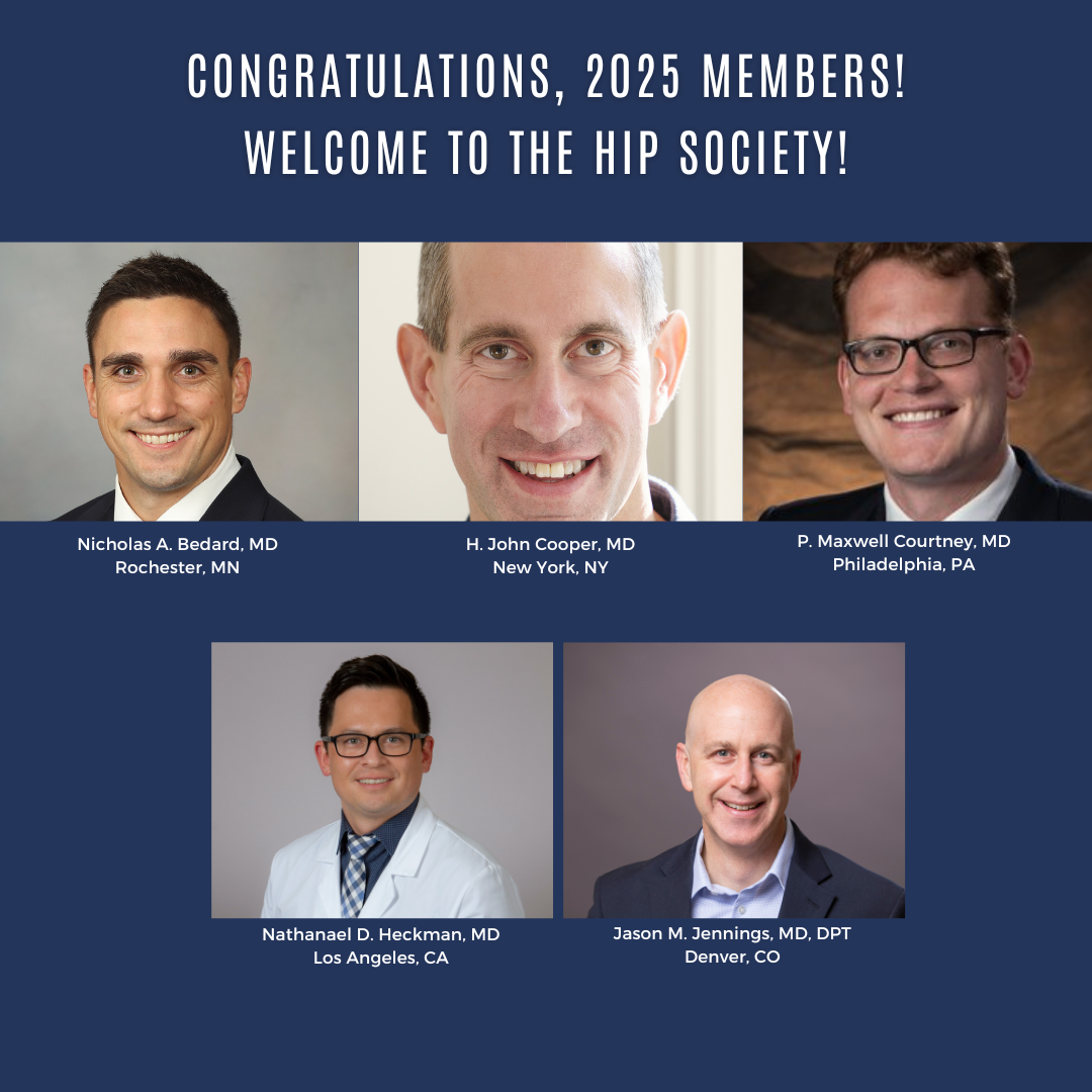 The Hip Society's membership is invitational. Candidates are identified by current members, and after an initial review by the Membership Committee Chair, may be invited to apply. Annually, only up to six (6) new Active members are inducted into the Society. The size of the Society is limited in its bylaws to no more than 100 Active members and 25 Adjunct members. Candidates undergo a rigorous review, and the process is competitive. Being a member of The Hip Society is an honor and a privilege, and a recognition of one's professional achievements.