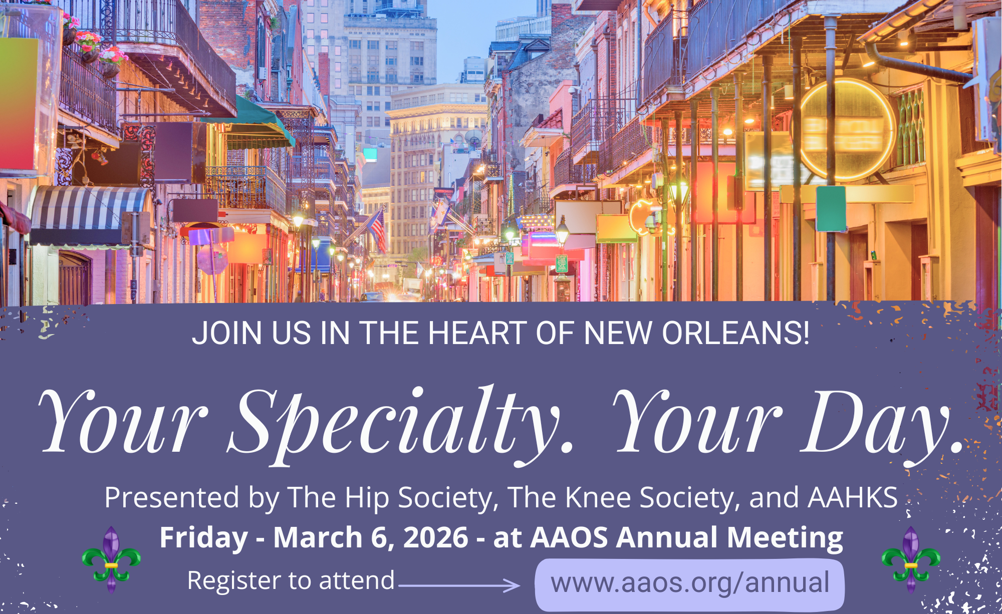 The Hip Society and AAHKS Specialty Day will be held on Friday, March 6, 2026 at the Morial Convention Center in New Orleans, LA (as part of the AAOS 2026 Annual Meeting).
